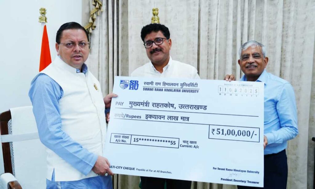 देहरादून: मुख्यमंत्री पुष्कर सिंह धामी से सोमवार को मुख्यमंत्री आवास में स्वामी राम हिमालयन यूनिवर्सिटी के प्रतिनिधिमंडल ने भेंट की। इस दौरान स्वामी राम हिमालयन यूनिवर्सिटी द्वारा उत्तरकाशी जिले के धराली एवं हर्षिल क्षेत्र में आई आपदा के राहत कार्यों के लिए मुख्यमंत्री राहत कोष में ₹ 51 लाख की धनराशि का योगदान दिया गया।